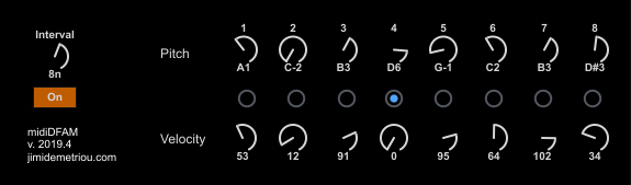 midiDFAM is a midi controller device inspired by the 8 step sequencer on the Moog DFAM. It is built in Max for use with Ableton live 9+ and features full range pitch and velocity controls for each step. The device rate is controlled by the Interval knob.